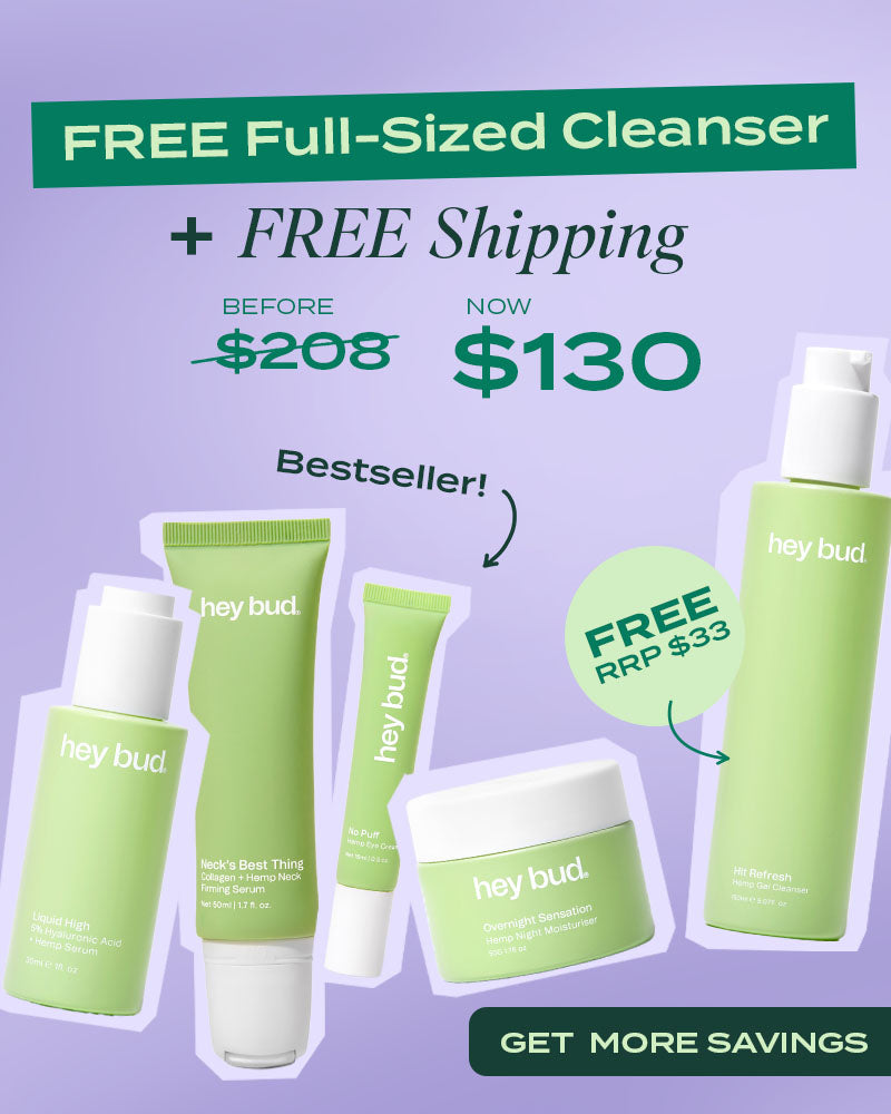 The Hey Bud Ageless Wonder is designed to target the key concerns of mature skin by providing deep hydration, improving elasticity, and smoothing fine lines. The 5% Hyaluronic Acid Serum plumps and hydrates dry, aging skin, while the Collagen + Hemp Neck Firming Serum firms and smooths the neck and décolletage. The Hemp Overnight Moisturiser nourishes and supports the skin’s barrier while you sleep, helping to restore softness, resilience, and an even tone. Together, these products help mature skin look firmer, more supple, and radiant with regular use.